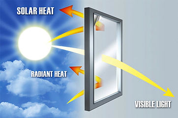 The illustration shows how window film reflects solar and radiant heat off the window, allowing visible light to pass through.